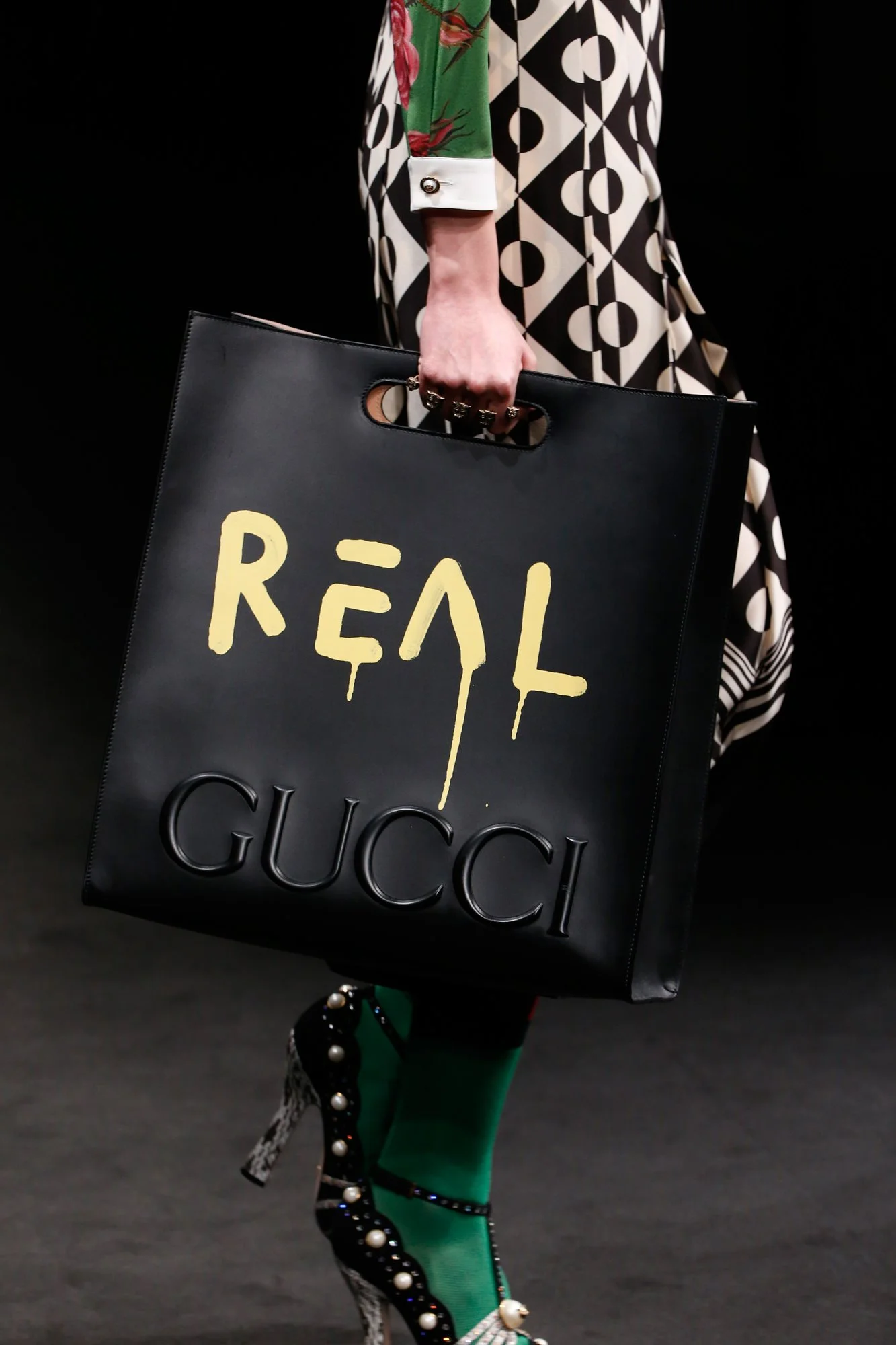 The collection can be summarized by one piece: a leather tote bag, embossed with the Gucci logo, upon which dripping painted letters intervene, spelling “REAL.” While we can read the “REAL,” most obviously, as the brand’s clever nod to its own history and tumult in a world that has copied and proliferated its logo to exhaustion (fake ‘Guchi’ can be found on the corner of 57th, two blocks away), something else takes place if we look at it with an art theoretical lens.