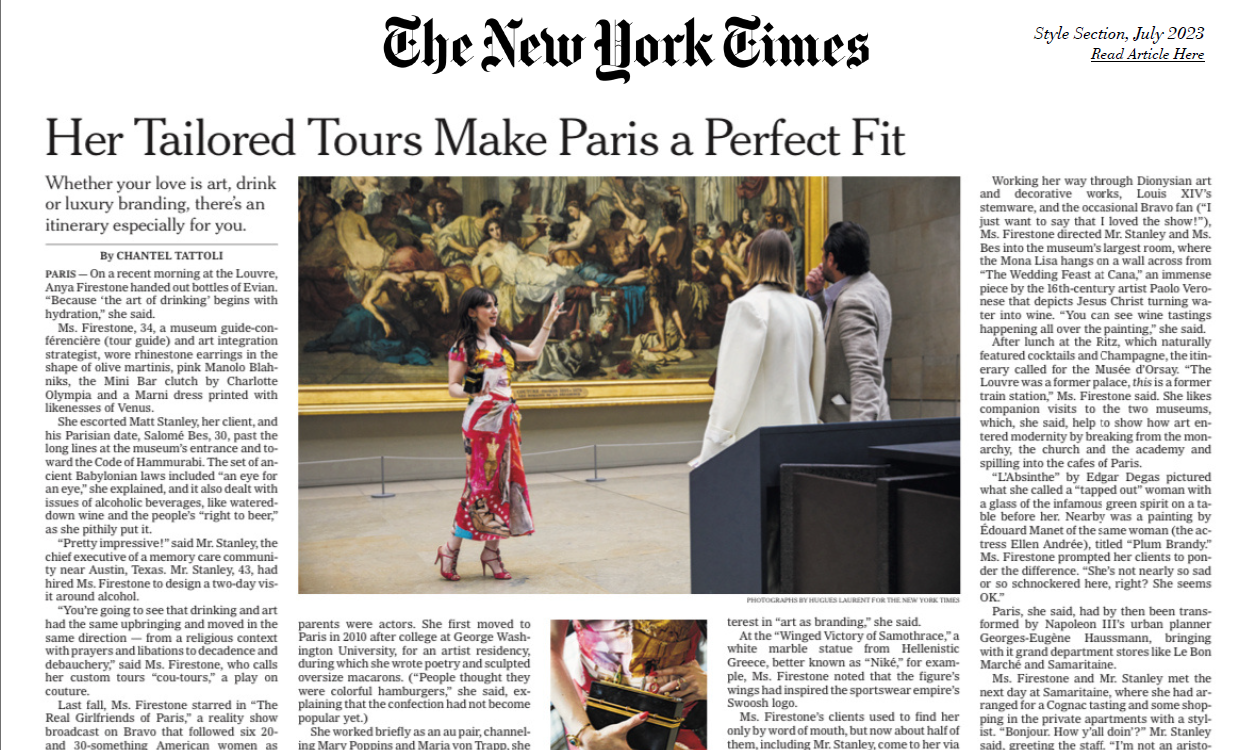 Nationally licensed by the French Ministry of Culture as a Guide-Conférencière, Anya Firestone designs and hosts tailored Cou-Tours and experiences in Paris, France built on storytelling through art, fashion, history, and culture. Each Cou-Tour can be designed for individual travelers and VICs, including couples, families with children, and small groups, and can be designed as corporate /team building experiences.